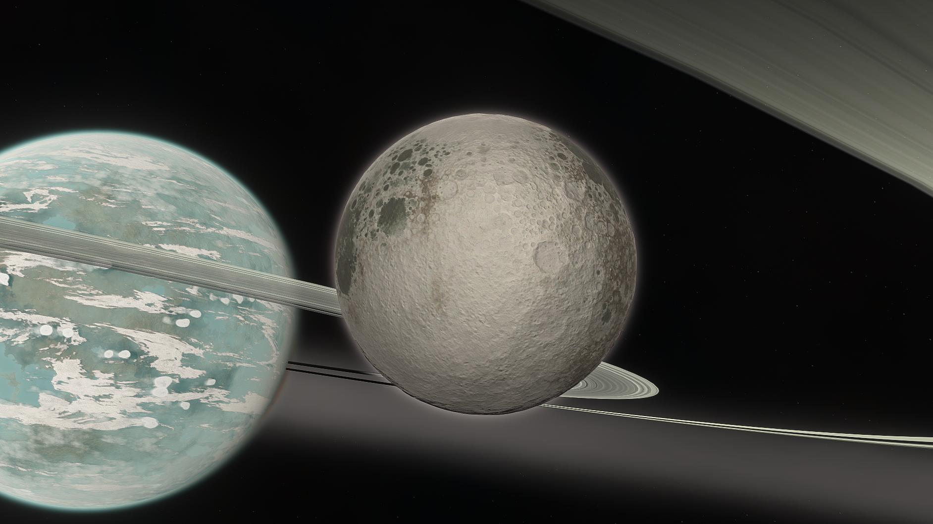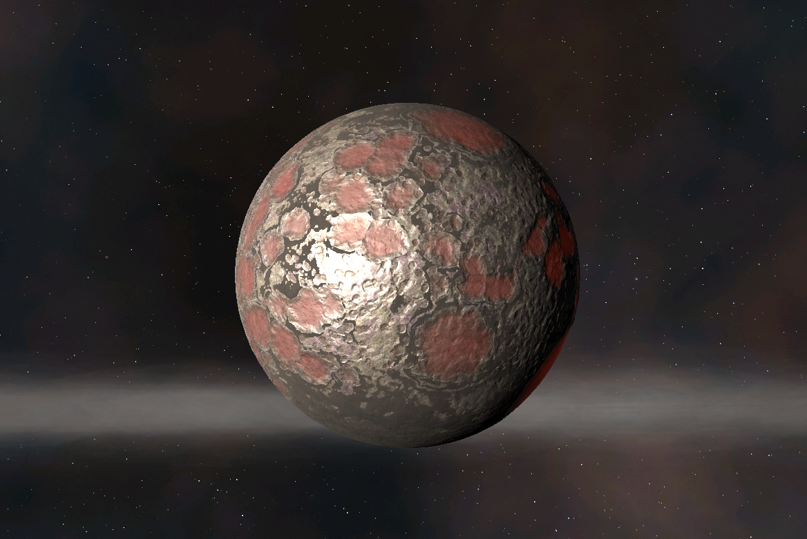 - Bis - This ball of ice was named for its crinkly cantaloupe terrain and canyons resembling a crunchy ice biscuit. The crust, made of ammonia, water, and nitrogen ice, conceals the liquid ocean beneath. This ocean causes extreme cryovolcanism leading to eruptions and crimson stains across the surface, especially inside of the canyons. Large impacts have formed flat planitia around the place, reminding you of Minmus. It also has a thin atmosphere.