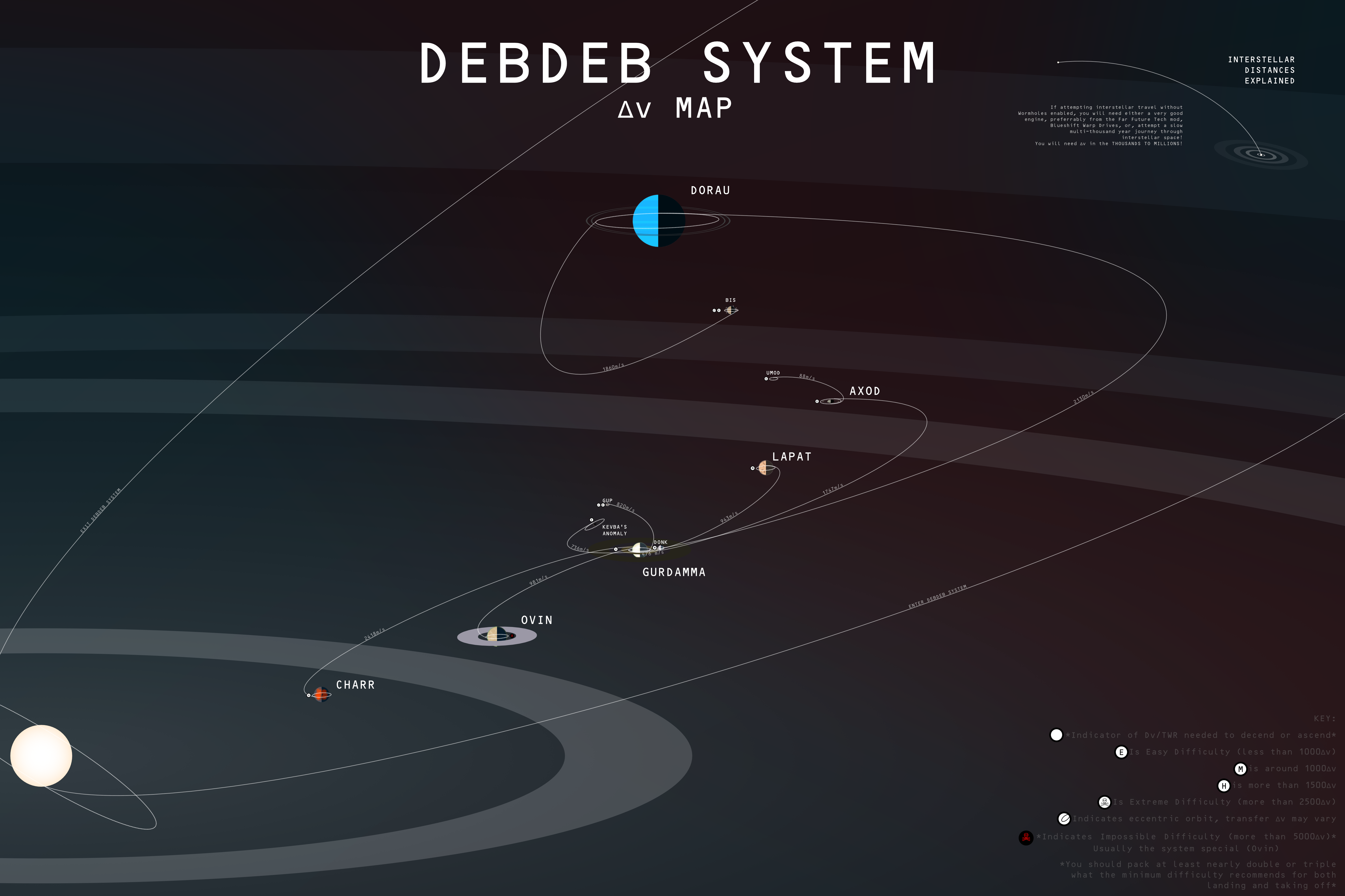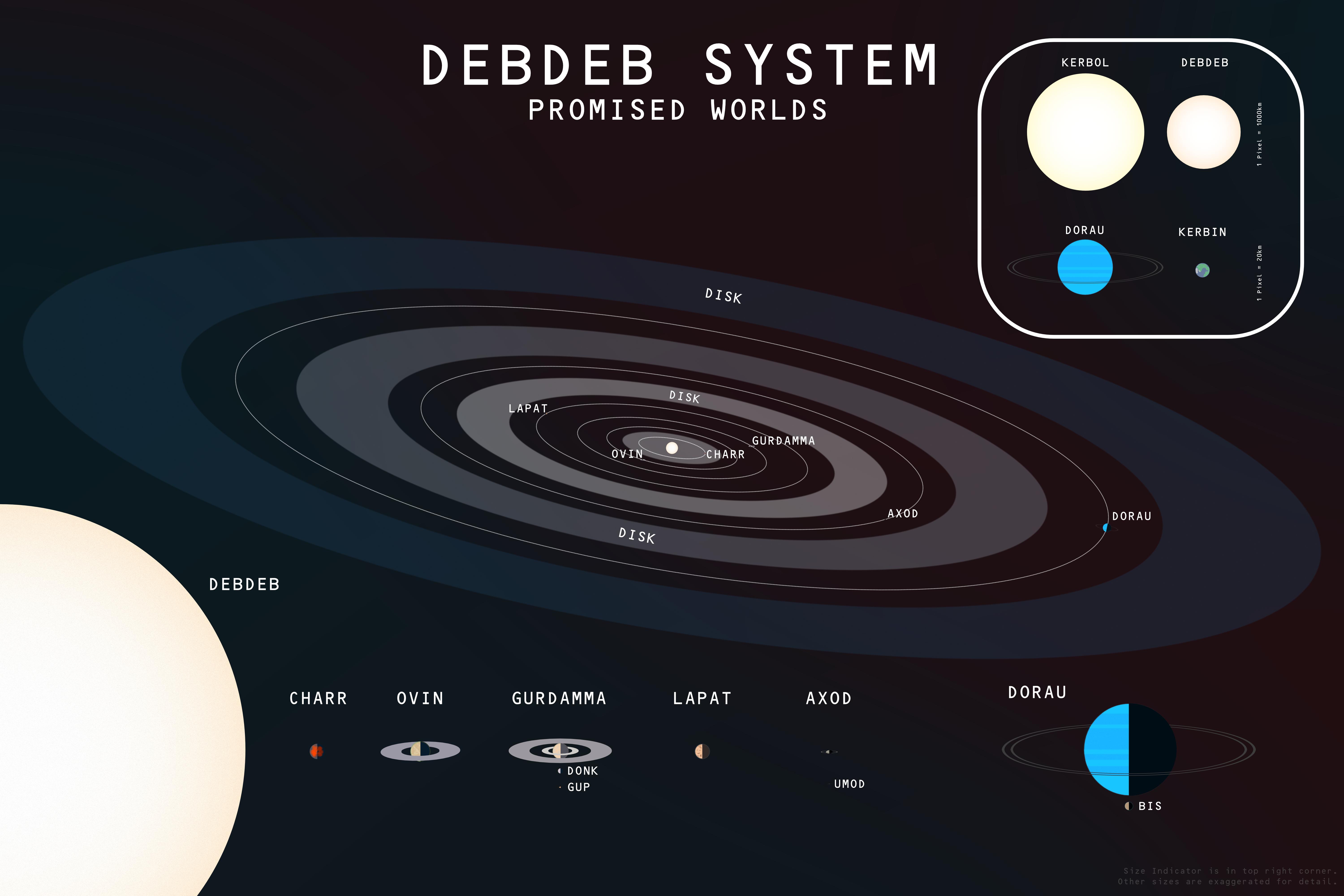 Centered within a vast protoplanetary disk, the Debdeb System is a young star system only a few light-years from Kerbol. Debdeb's planets are a glimpse of a distant past: there's Charr, a fiery, iron-bound ancestor of Moho; Gurdamma, a cratered oasis teeming with the ingredients for life; Ovin, a superheavy wasteland with gorgeous rings; and much, much more. Want to surf on the MASSIVE low-gravity cliffs of Axod? Dive into the storms of Dorau? or perhaps witness the Cryovolcanoes of Bis? in Debdeb, you'll feel right at home!