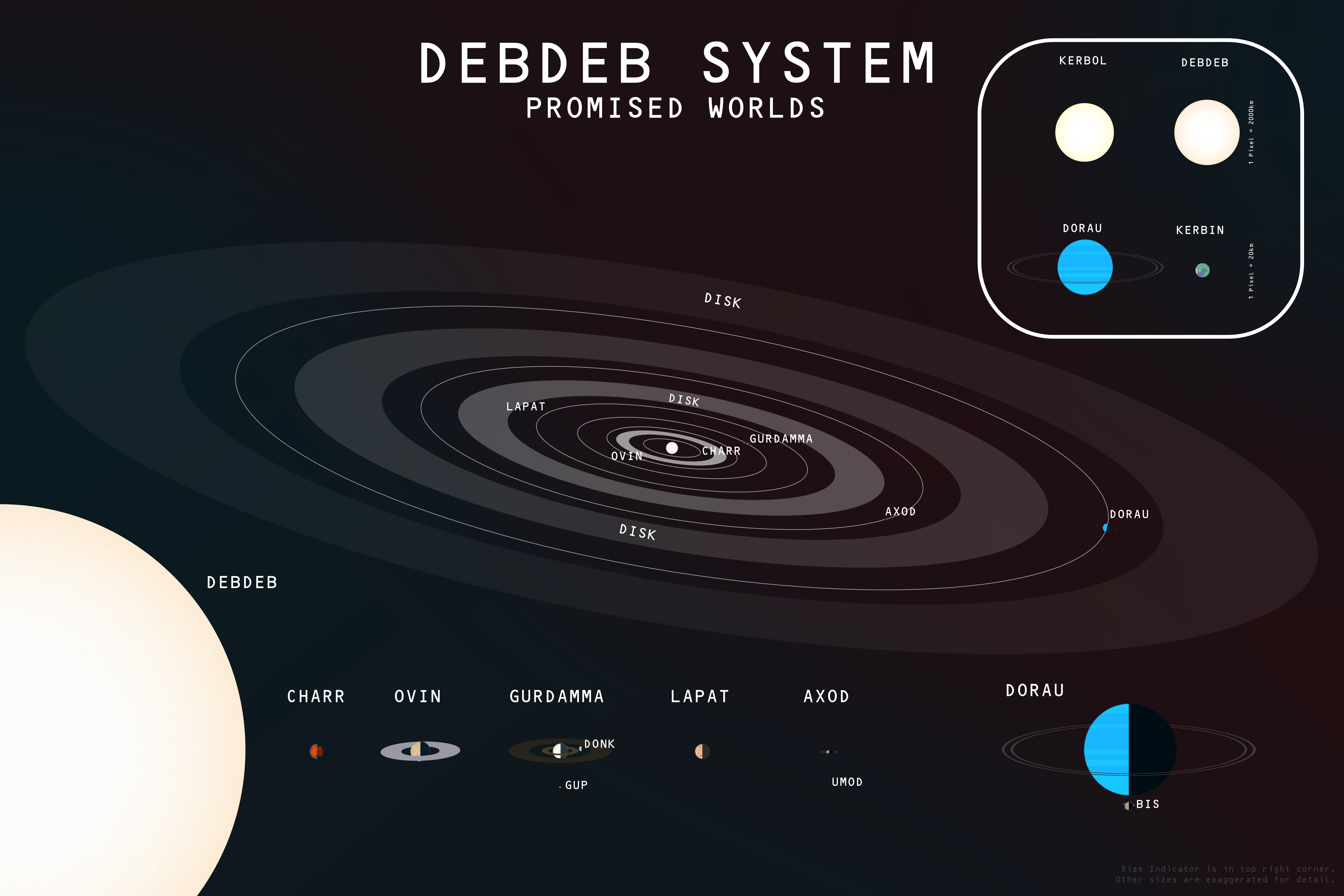 - Debdeb - On the cosmic timescale, Debdeb is a baby star. 10 million years ago, a large cold cloud of gas and dust collapsed due to gravity and formed this orange dwarf star. However, due to it's age, its slightly larger than Kerbol, and vastly more active, which leads to lots of solar activity. Surrounding it is a proto-planetary disk containing the ingredients for new planets. The planets have also had the proper time to clear their orbits, making the ring-like structure of the proto-disk. Within this disk orbits 6 young planets, each with gripping stories to tell.