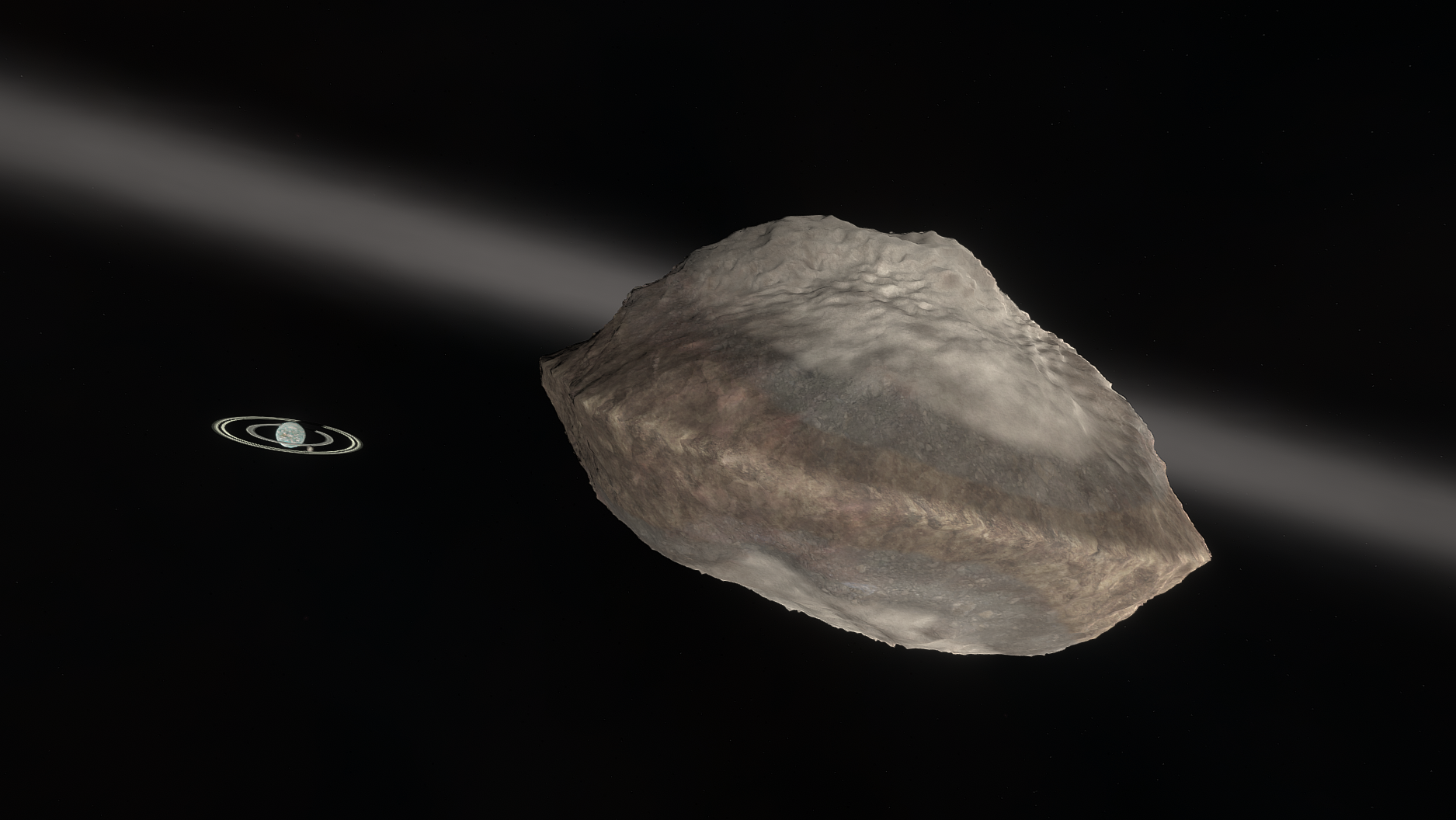 Gup - This little nugget was flung into a far elliptical orbit, likely after the recent collision that formed Donk. It spins very fast which has flattened it into a disk shape. Landing around the equator is extremely difficult thanks to this spin.