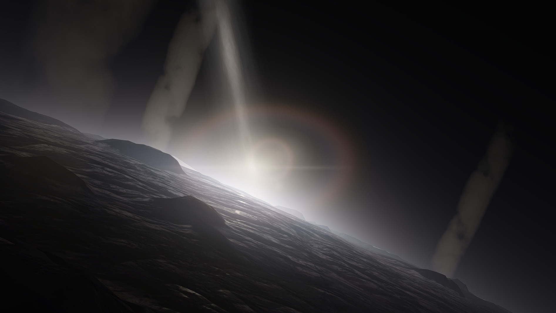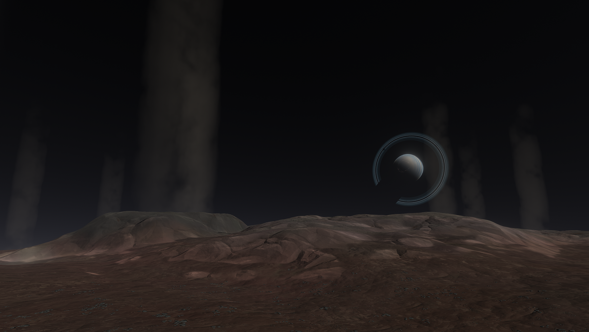 Bis is frequently known for it's cryovolcanic plumes, which oddly is the most interesting thing about this moon. It surface is dazzled with dirty ice, but from afar, it looked rather blue. Oh well, mistakes are made in astronomy. Mentioning that, It also appears blue due to it's low and hazy atmosphere. You'll occasionally spot Dorau Rising in the distance