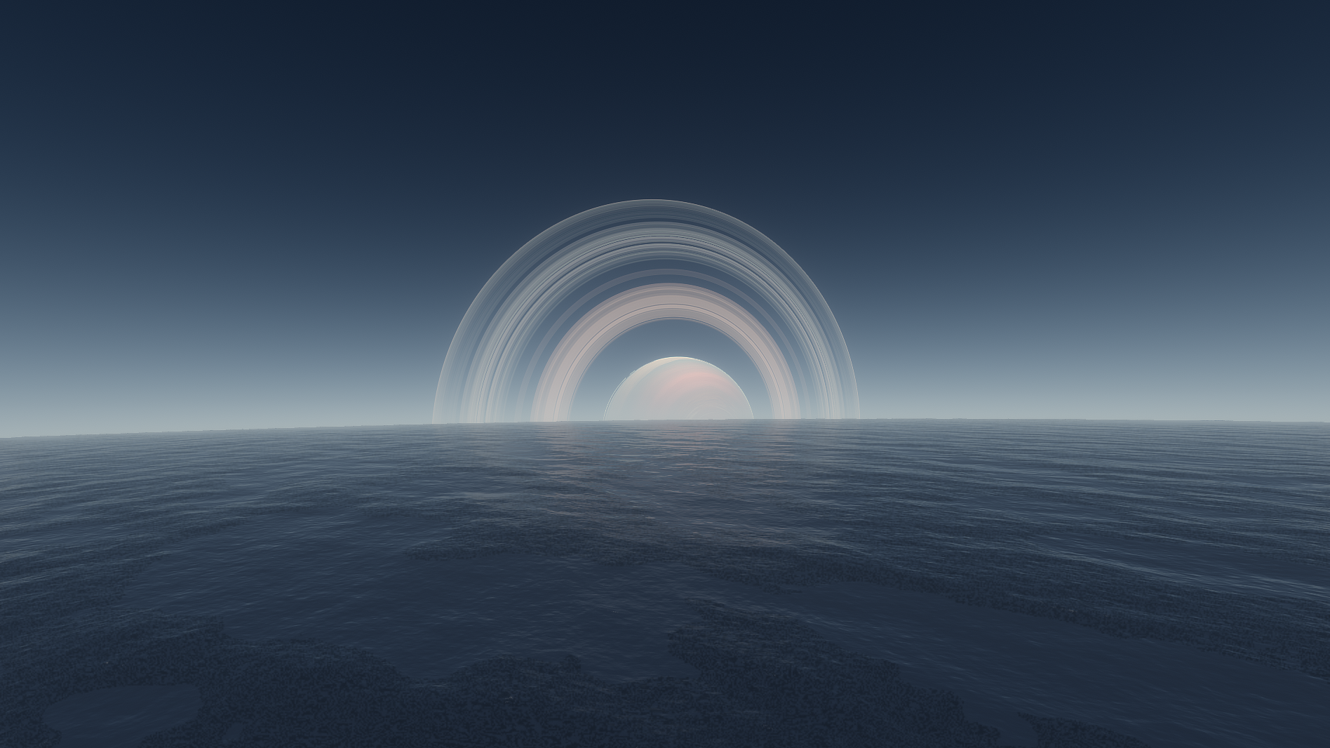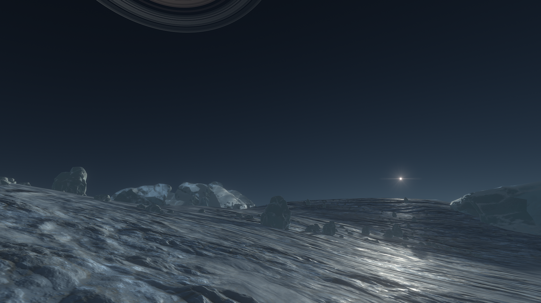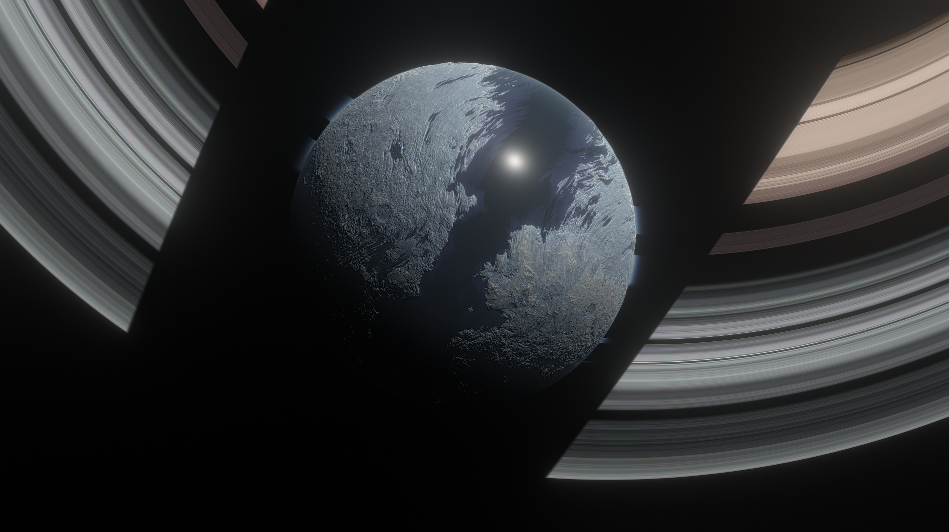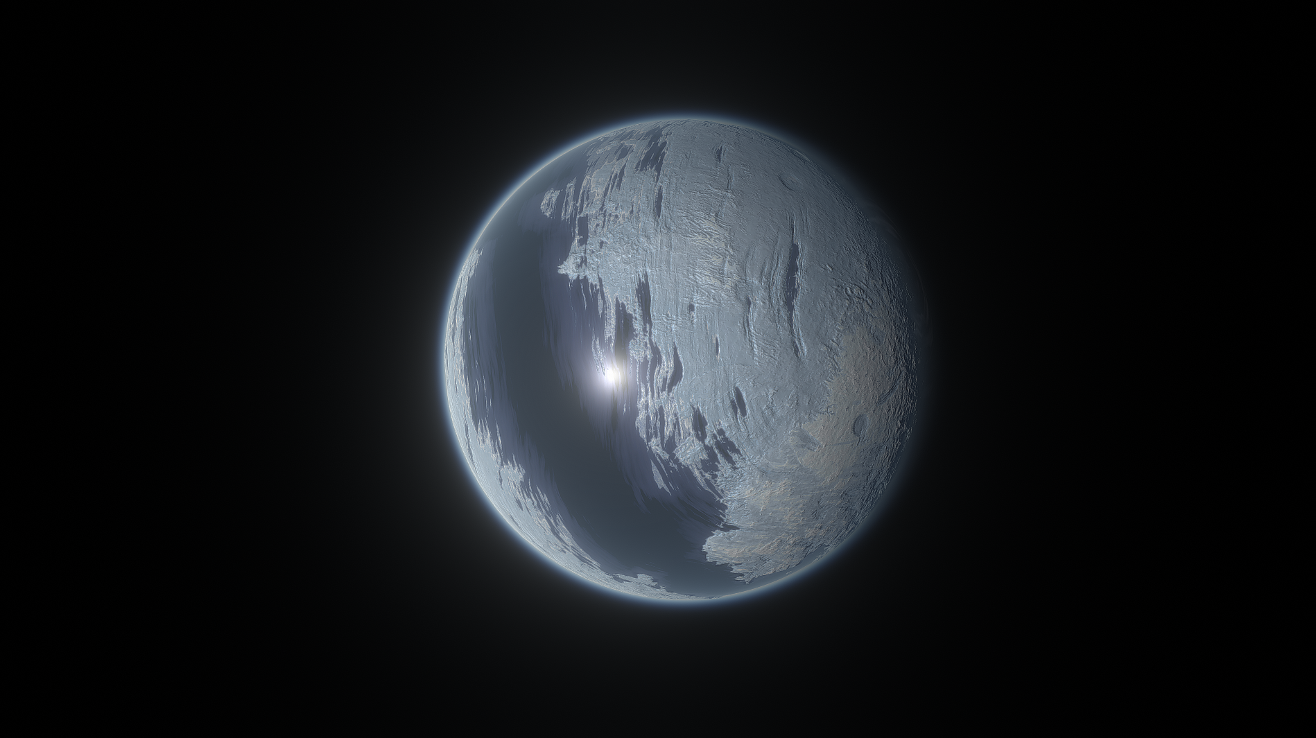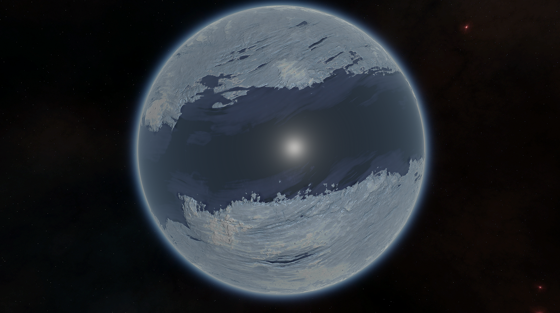 Merbel also featuers a striking equatorial nearly frozen ocean, which near the coasts will freeze methane bubbles trapped in icebergs.